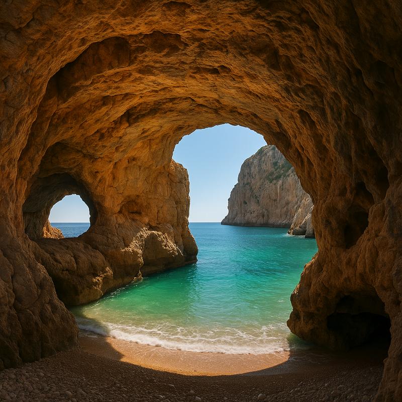 Один из самых живописных пляжей Коста-Бланки — с прозрачной водой и известной «Пещерой аркообразных сводов» (Cova dels Arcs).